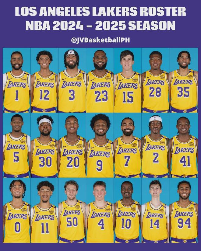 2024-25賽季常規賽開始之前,湖人的陣容名單:詹姆斯、濃眉、里夫斯、拉塞爾、八村塁、范德比爾特、克內克特、文森特、海斯、克里斯蒂、雷迪什、席菲諾、伍德、劉易斯、布朗尼、科洛克、特拉奧雷、奧利瓦里。