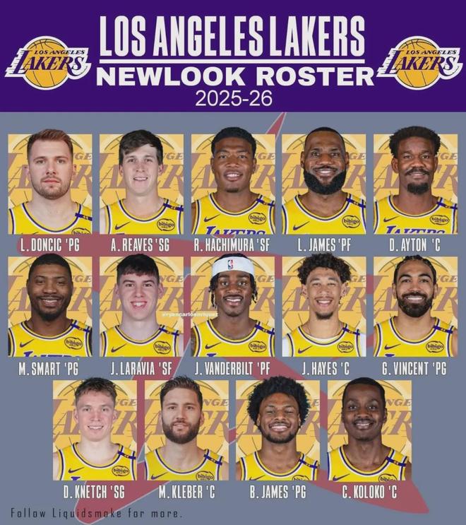 2025-26賽季開始之前,湖人的陣容名單:東契奇、詹姆斯、里夫斯、文森特、斯瑪特、克內克特、八村壘、范德比爾特、拉拉維亞、艾頓、海斯、克萊伯、阿杜-蒂耶羅、布朗尼、尼克-史密斯、科洛克、克里斯-馬農 。