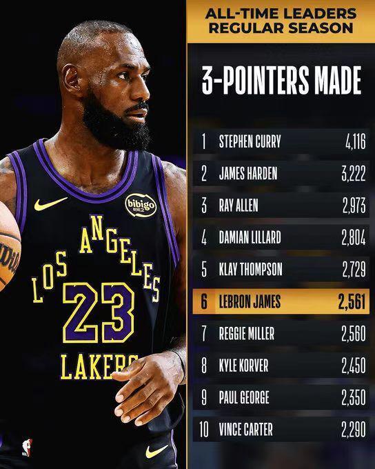 其二,詹姆斯生涯三分命中數超越雷吉-米勒,升至NBA歷史第六。